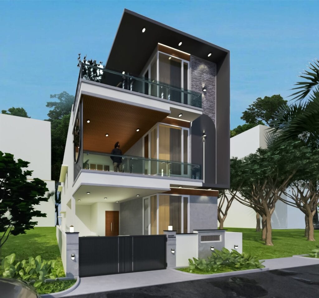 A duplex designed for our Client Mr. Saurabh with a single car parking space to ensure a larger living room with dining and kitchen on the ground floor.